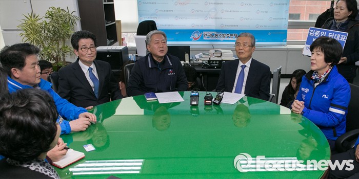 (서울=포커스뉴스) 김종인(오른쪽 두번째) 더불어민주당 비대위 대표가 7일 오후 서울 영등포구 한국노동조합총연맹을 방문해 김동만(오른쪽 세번째) 위원장과 대화하고 있다.
