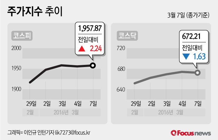 (서울=포커스뉴스) 7일 코스피지수는 전날 보다 0.11%(2.24포인트) 오른 1957.87에 장을 마쳤다. 코스닥지수는 전일 대비 0.24%(1.63포인트) 내린 672.21에 마감했다.