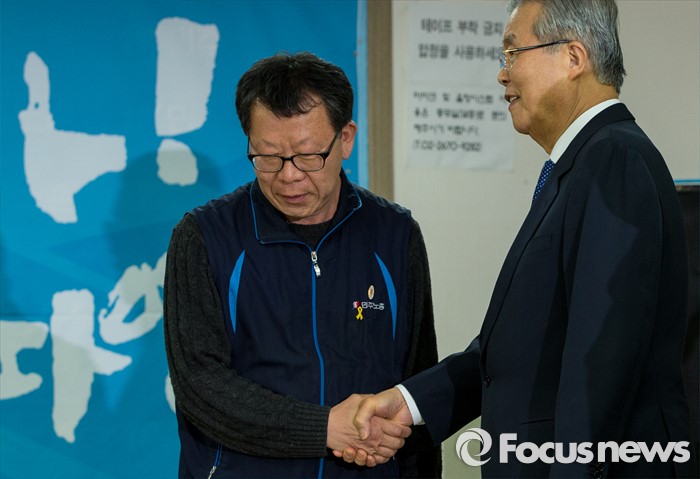 (서울=포커스뉴스) 7일 오후 서울 중구 민주노총을 방문한 김종인(오른쪽) 더불어민주당 비상대책위원회 대표가 최종진 민주노총 위원장직무대행을 만나 악수하고 있다.