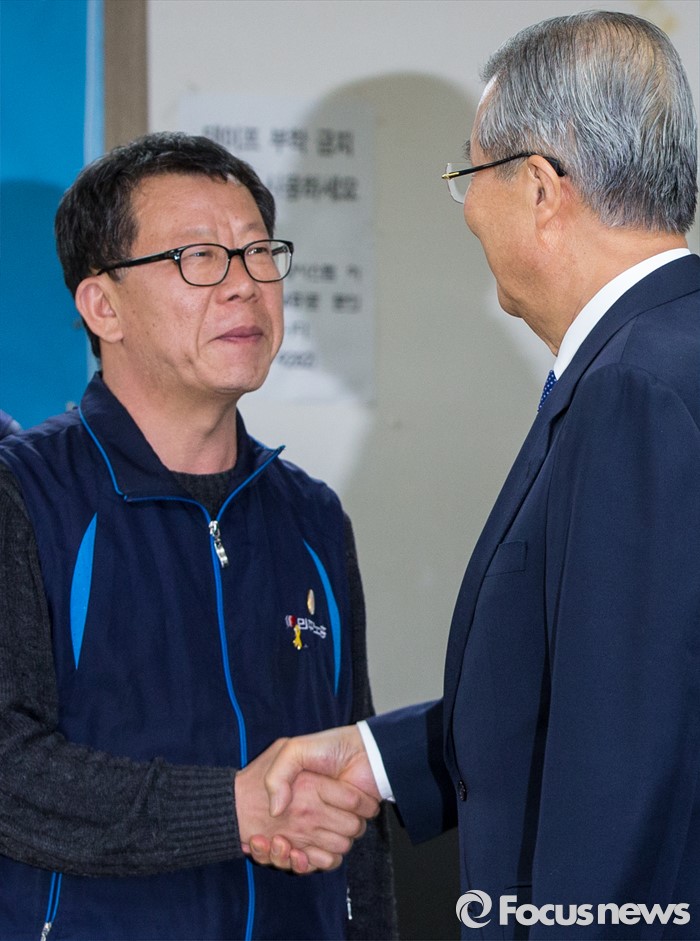 (서울=포커스뉴스) 7일 오후 서울 중구 민주노총을 방문한 김종인(오른쪽) 더불어민주당 비상대책위원회 대표가 최종진 민주노총 위원장직무대행을 만나 악수하고 있다.