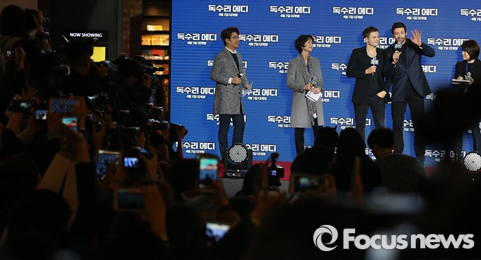(서울=포커스뉴스) 7일 오후 서울 영등포구 IFC몰 광장에서 열린 영화 '독수리 에디' 레드카펫 행사에 참석한 배우 휴 잭맨(오른쪽)이 인사말을 하고 있다.