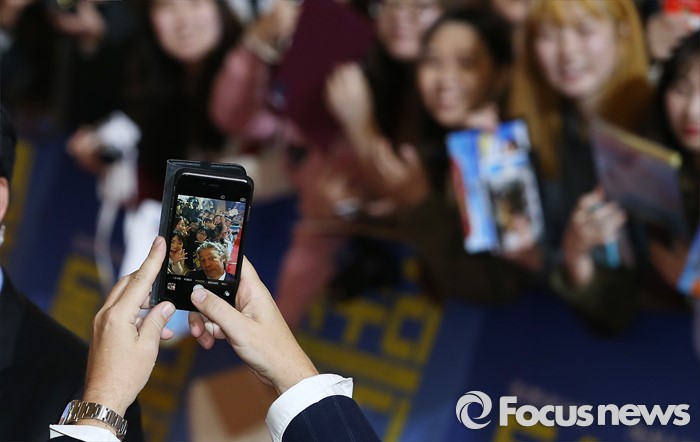 (서울=포커스뉴스) 7일 오후 서울 영등포구 IFC몰 광장에서 열린 영화 '독수리 에디' 레드카펫 행사에 참석한 덱스터 플레처 감독이 팬들과 기념 사진촬영을 하고 있다.