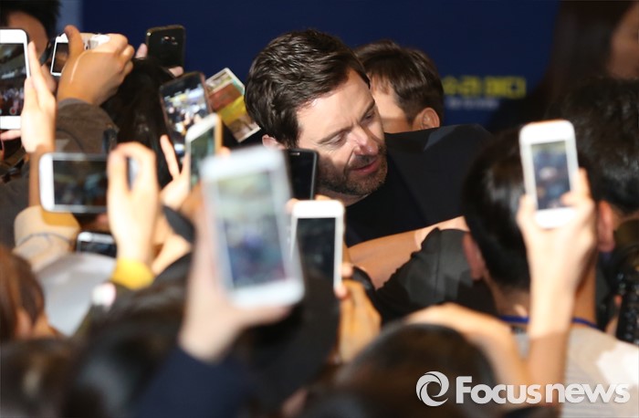 (서울=포커스뉴스) 7일 오후 서울 영등포구 IFC몰 광장에서 열린 영화 '독수리 에디' 레드카펫 행사에 참석한 배우 휴 잭맨이 팬들과 사진을 찍고 있다.