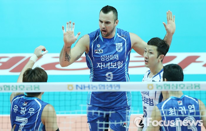 이날 승리한 삼성화재는 23승 15패로 승점 66점을 기록하며 승점 64점의 대한항공을 제치고 3위로 시즌을 마감했다. 반면 KB손해보험은 10승 26패, 승점 6위로 시즌를 마무리 했다. 삼성화재는 3위로 시즌을 마무리해 준플레이오프에서 홈 어드밴티지를 누릴 수 있게 됐다. 양팀간의 준플레이오프는 오는 10일 삼성화재의 홈구장인 대전충무체육관에서 열리게 된다.(안산=포커스뉴스) 지난 1월26일 오후 안산상록수체육관에서 열린 '2015-2016NH농협 V-리그' 남자부 OK저축은행-삼성화재 경기에서 삼성화재 그로저가 스파이크 서브로 득점을 올린뒤 동료들과 환호하고 있다. 2016.01.26 우정식 기자