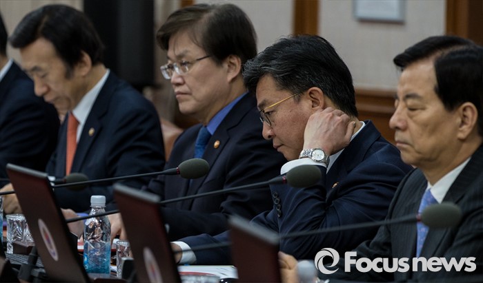 (서울=포커스뉴스) 8일 오전 서울 종로구 정부서울청사에서 열린 국무회의에서 홍용표 통일부 장관이 목을 만지고 있다.