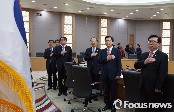 (세종=포커스뉴스) 황교안 국무총리와 국무위원들이 8일 오전 세종시 정부세종청사 국무회의장에서 서울-세종 영상회의로 열린 국무회의에 참석해 국기에 대한 경례를 하고 있다.