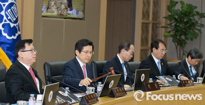 (세종=포커스뉴스) 황교안 국무총리가 8일 오전 세종시 정부세종청사 국무회의장에서 서울-세종 영상회의로 열린 국무회의에 참석해 회의시작을 알리는 의사봉을 두드리고 있다.