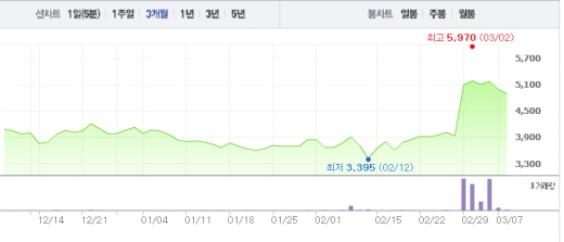 반면 3일을 제외하고 6일 연속 상승세를 기록했던 비츠로테크는 흐름을 이어가고 있다. 비츠로테크는 전날보다 10원(0.19%) 오른 5390원에 거래중이다.