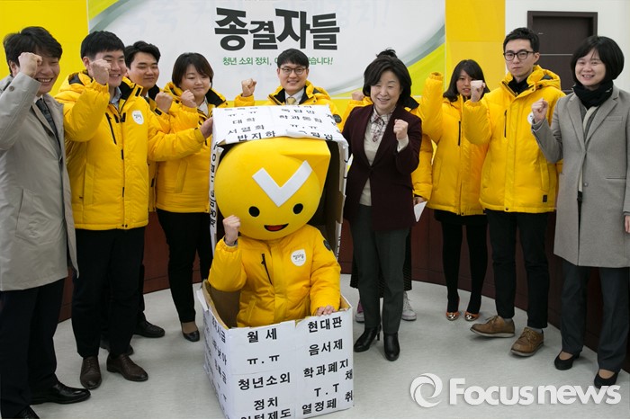 한편 온라인투표시스템 이용방법 등은 관련 홈페이지(http://www.kvoting.go.kr)에서 확인이 가능하다.(서울=포커스뉴스) 11일 오전 서울 여의도 국회에서 정의당 청년 선대본 · 청년 후보단 '종결자들' 발대식 중, '땀돌이' 캐릭터가 교육·노동·주거 불평등을 종결하겠다는 의미의 퍼포먼스를 하고 있다. 2016.02.11 박철중 기자