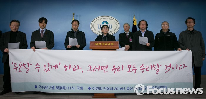 (서울=포커스뉴스) 8일 오전 서울 여의도 국회 정론관에서 야권의 단합과 2016년 총선 승리를 위한 수도권연대 회원들이 발족 및 야권 단일화를 촉구하는 기자회견을 하고 있다.