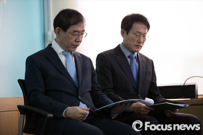 (서울=포커스뉴스) 박원순(왼쪽) 서울시장과 조희연 서울시교육감이 8일 오전 종로구 서울시교육청에서 열린 '서울시-교육청 교육협력사업 기자회견'에 참석해 자료를 살펴보고 있다.