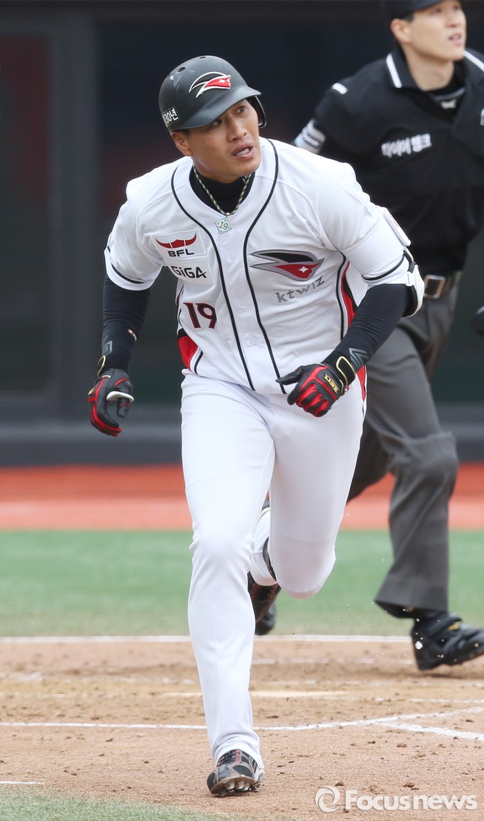 (수원=포커스뉴스) 8일 수원 kt위즈파크에서 열린 2016 KBO리그 시범경기 두산-kt 경기에서 3회 kt 김상현이 연타석 우중월 솔로 홈런을 날리고 타구를 바라보며 1루로 뛰어 나가고 있다.
