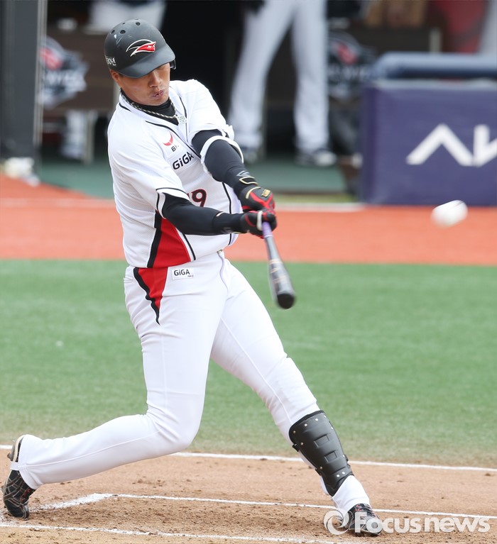(수원=포커스뉴스) 8일 수원 kt위즈파크에서 열린 2016 KBO리그 시범경기 두산-kt 경기에서 1회말 2사 1루에서 kt 김상현이 중월2점 홈런을 날리고 있다.