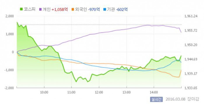 이날 코스피는 전일 대비 0.05% 오른 1958.94로 장을 시작했다. 이후 지수는 하락세로 전환하며 장중 한때 1930선으로 후퇴하기도 했다.