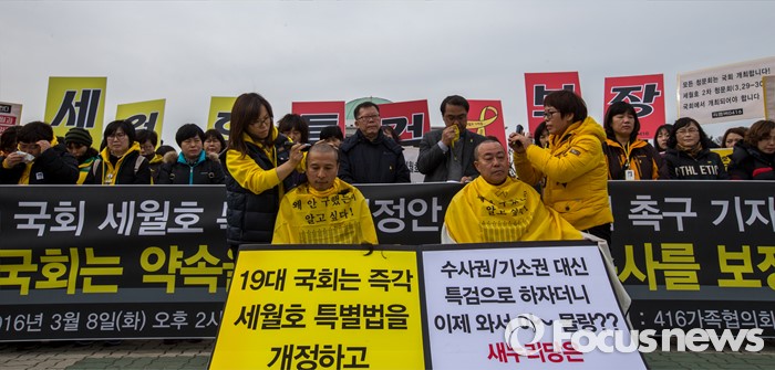 (서울=포커스뉴스) 8일 오후 서울 영등포구 국회 앞에서 열린 '19대 국회 세월호 특별법 개정안 특검 처리 촉구 기자회견'에 참석한 4.16가족협의회 관계자들이 정부에 세월호 참사 특검처리 약속 이행을 촉구하며 삭발 하고 있다.