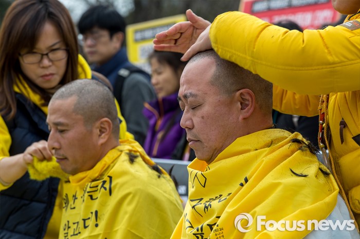 (서울=포커스뉴스) 8일 오후 서울 영등포구 국회 앞에서 열린 '19대 국회 세월호 특별법 개정안 특검 처리 촉구 기자회견'에 참석한 4.16가족협의회 관계자들이 정부에 세월호 참사 특검처리 약속 이행을 촉구하며 삭발 하고 있다.