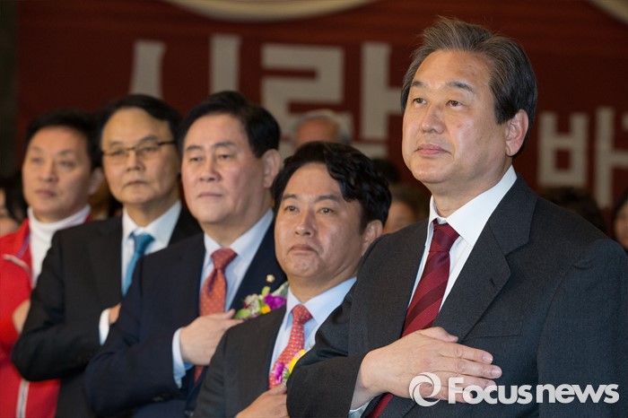 (서울=포커스뉴스) 김무성(오른쪽) 새누리당 대표와 최경환(오른쪽 세번째) 새누리당 의원이 8일 오후 서울 마포구 신촌 케이터틀 컨벤션홀에서 열린 새누리당 서울시당 서대문갑 당원교육 및 전진대회에 참석해 국민의례를 하고 있다.