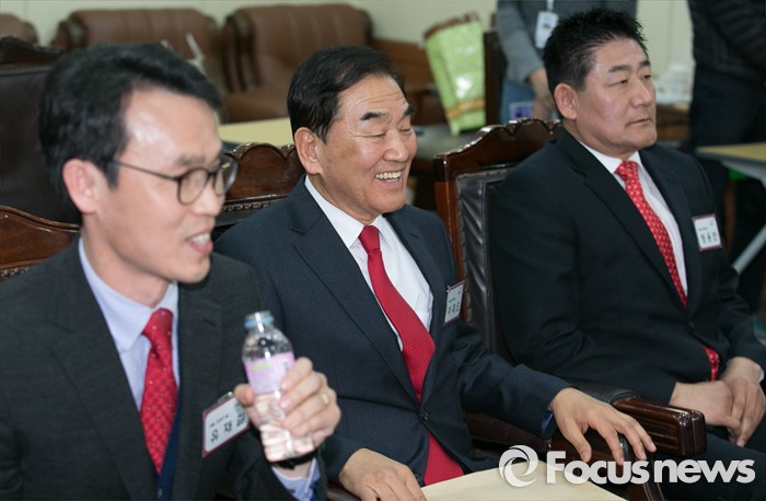 (서울=포커스뉴스) 8일 오후 서울 여의도 새누리당사에서 열린 20대 총선 분구·통합·경계조정 지역구 공천신청자 면접에 서울 은평을에 신청한 이재오 의원과 예비후보들이 공관위원들의 질문을 듣고 있다. 왼쪽부터 유재길 예비후보, 이 의원, 정용만 예비후보.