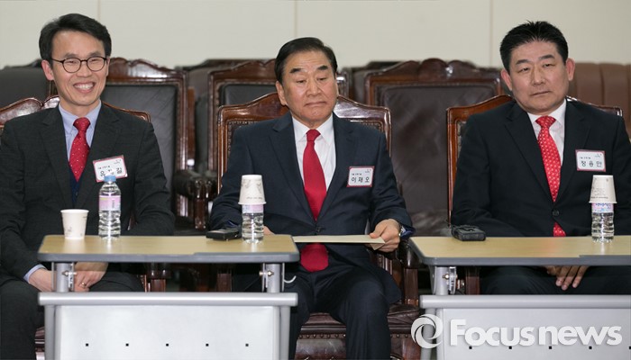 (서울=포커스뉴스) 8일 오후 서울 여의도 새누리당사에서 열린 20대 총선 분구·통합·경계조정 지역구 공천신청자 면접에 서울 은평을에 신청한 이재오 의원과 예비후보들이 공관위원들의 질문에 답하고 있다. 왼쪽부터 유재길 예비후보, 이 의원, 정용만 예비후보.