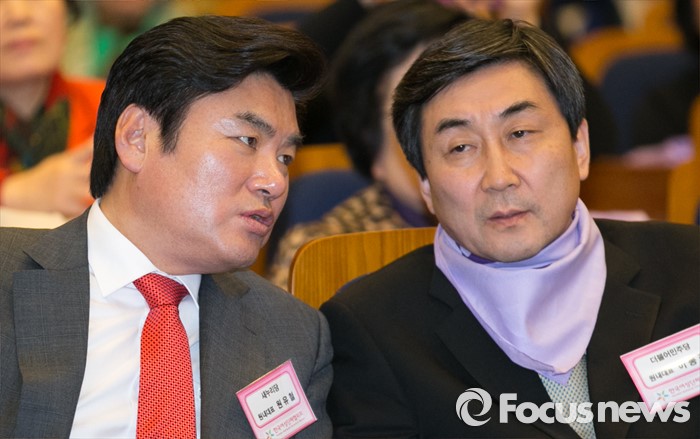 (서울=포커스뉴스) 8일 오후 서울 여의도 국회 헌정기념관에서 열린 세계 여성의 날 기념대회에 참석한 원유철(왼쪽) 새누리당 원내대표와 이종걸 더불어민주당 원내대표가 대화하고 있다.