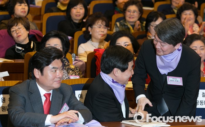 (서울=포커스뉴스) 8일 오후 서울 여의도 국회 헌정기념관에서 열린 세계 여성의 날 기념대회에 참석한 안철수(오른쪽) 국민의당 상임공동대표가 먼저 퇴장하며 이종걸(가운데) 더불어민주당 원내대표와 악수하고 있다. 왼쪽은 원유철 새누리당 원내대표.