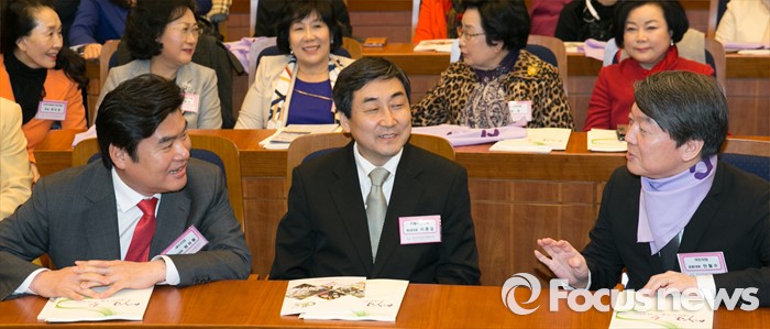 (서울=포커스뉴스) 8일 오후 서울 여의도 국회 헌정기념관에서 열린 세계 여성의 날 기념대회에 참석한 원유철(왼쪽부터) 새누리당 원내대표, 이종걸 더불어민주당 원내대표, 안철수 국민의당 상임공동대표가 대화하고 있다.