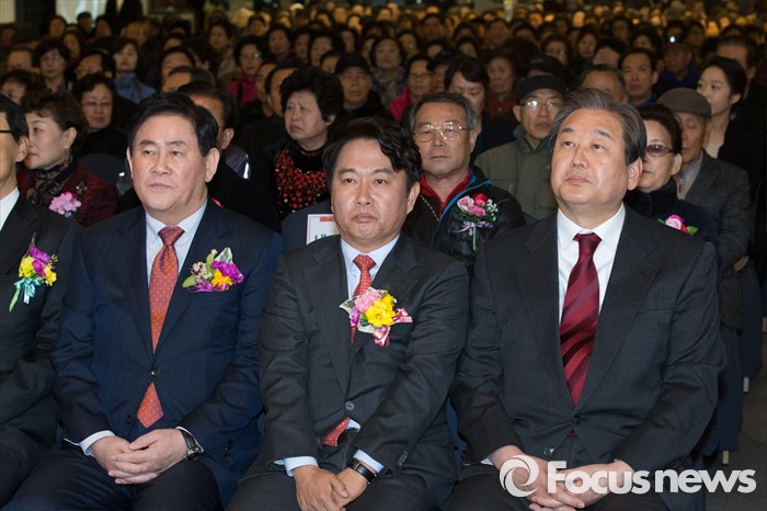 (서울=포커스뉴스) 김무성(오른쪽) 새누리당 대표와 최경환(왼쪽) 새누리당 의원이 8일 오후 서울 마포구 신촌 케이터틀 컨벤션홀에서 열린 새누리당 서울시당 서대문갑 당원교육 및 전진대회에 참석해 자리에 앉아 있다. 왼쪽부터 최경환 의원, 이성헌 예비후보, 김무성 새누리당 대표.