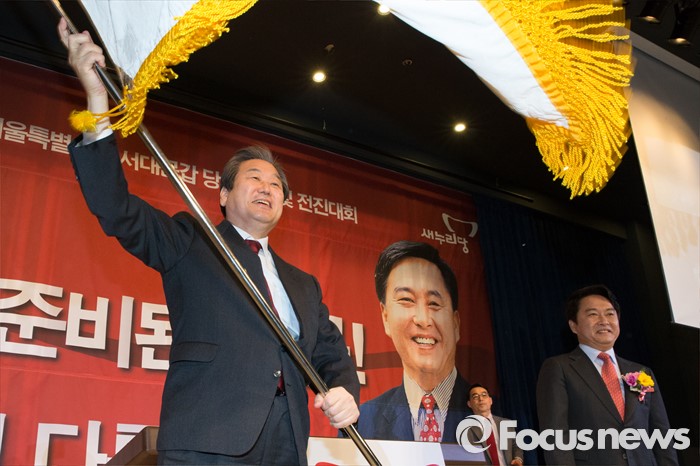 (서울=포커스뉴스) 김무성(왼쪽) 새누리당 대표가 8일 오후 서울 마포구 신촌 케이터틀 컨벤션홀에서 열린 새누리당 서울시당 서대문갑 당원교육 및 전진대회에 참석해 당기를 흔들고 있다.