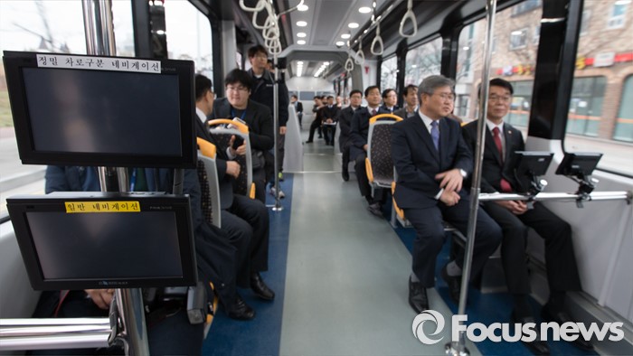 (청주=포커스뉴스) 강호인 국토교통부 장관이 8일 오후 청주시 청원구 오창읍 충북테크노파크에서 열린 차세대 도로교통용 정밀위성항법(GPS) 시연회에서 정밀차로구분 네비게이션이 설치된 바이모달트램을 시승 하고 있다.