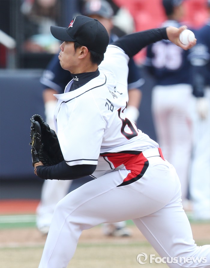 (수원=포커스뉴스) 8일 수원 kt위즈파크에서 열린 2016 KBO리그 시범경기 두산-kt 경기에서 9회 kt 투수 김재윤이 투구하고 있다.