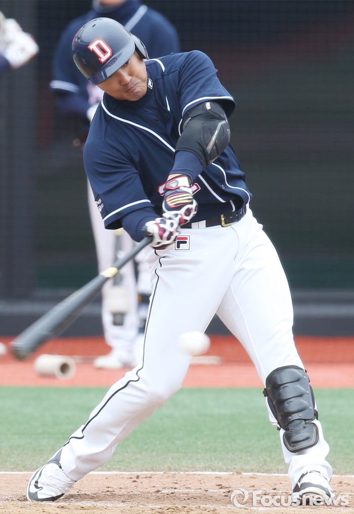 (수원=포커스뉴스) 8일 수원 kt위즈파크에서 열린 2016 KBO리그 시범경기 두산-kt 경기에서 7회 2사 2루에서 두산 홍성흔이 타격하고 있다.