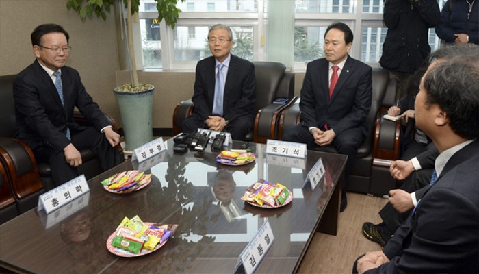 (서울=포커스뉴스) 8일 오전 대구 동구 더불어민주당 대구시당을 방문한 김종인 비대위 대표가 대구지역 20대 총선 예비후보들과 면담을 하고 있다. 왼쪽부터 김부겸 수성갑 예비후보, 김 대표, 조기석 대구시당 위원장. <사진제공=더불어민주당>