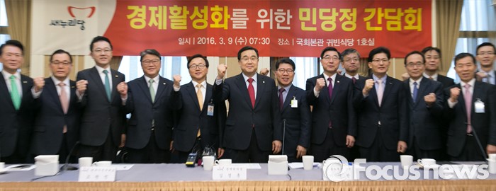 (서울=포커스뉴스) 9일 오전 서울 여의도 국회 귀빈식당에서 경제활성화를 위한 민·당·정 간담회에 앞서 참석자들이 파이팅을 외치며 취재진을 향해 포즈를 취하고 있다. 왼쪽부터 김한표, 이채익, 강석훈 새누리당 의원, 조원진 원내수석부대표, 이동근 대한상의 상근부회장, 김정훈 새누리당 정책위의장, 반원익 중기연합회 상근부회장, 이기권 고용노동부 장관, 최상목 기획재정부 1차관, 송재희 중소기업중앙회 상근부회장, 김준경 한국개발연구원장, 이관섭 산업통상자원부 1차관, 김도훈 산업연구원장, 방문규 보건복지부 차관.