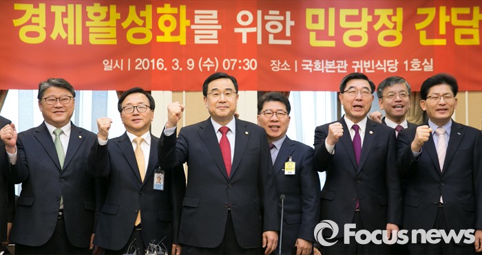 (서울=포커스뉴스) 9일 오전 서울 여의도 국회 귀빈식당에서 경제활성화를 위한 민·당·정 간담회에 앞서 참석자들이 파이팅을 외치며 취재진을 향해 포즈를 취하고 있다. 왼쪽부터 조원진 새누리당 원내수석부대표, 이동근 대한상의 상근부회장, 김정훈 정책위의장, 반원익 중기연합회 상근부회장, 이기권 고용노동부 장관, 최상목 기획재정부 1차관, 송재희 중소기업중앙회 상근부회장.