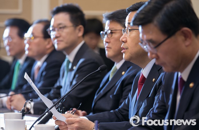 (서울=포커스뉴스) 9일 오전 서울 여의도 국회 귀빈식당에서 열린 경제활성화를 위한 민·당·정 간담회에 참석한 김정훈(오른쪽 두번째) 새누리당 정책위의장이 모두발언을 하고 있다.