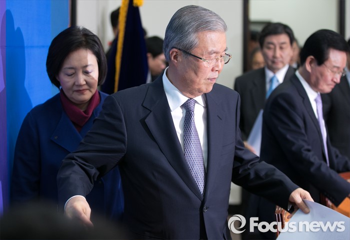 (서울=포커스뉴스) 김종인 더불어민주당 비대위 대표가 9일 오전 서울 여의도 국회에서 열린 비상대책위원회의에 참석하고 있다. 왼쪽부터 박영선 비대위원, 김 대표, 이종걸 원내대표, 변재일 비대위원.