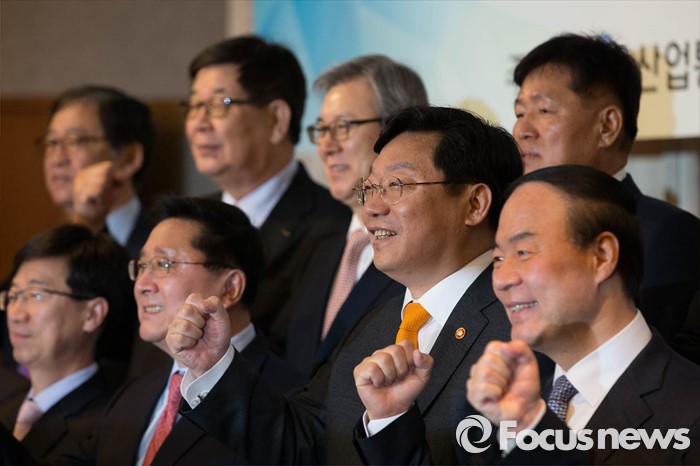 (서울=포커스뉴스) 주형환(오른쪽에서 두 번째) 산업통상자원부 장관이 9일 오전 서울 중구 롯데호텔에서 열린 '주요 투자기업 간담회'에 앞서 투자기업 사장단들과 기념촬영을 하고 있다. 이날 주 장관은 30대 그룹 123조 투자계획이 차질없이 이행되도록 밀착 지원하겠다고 밝혔다.