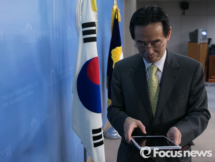 (서울=포커스뉴스) 홍창선 더불어민주당 공천관리위원장이 9일 오전 서울 여의도 국회 정론관에서 20대 총선 1차 경선지역과 관련 브리핑을 마친 뒤 퇴장하고 있다. 홍 위원장은 이날 브리핑 중 취재관행을 바꾸기 위한 언론인과 대화를 하던 중 일부 항의를 받았다.