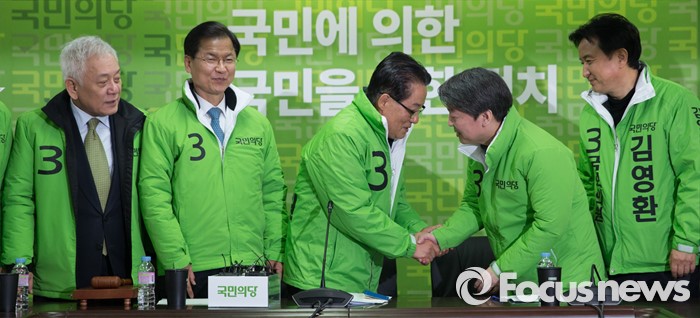(서울=포커스뉴스) 국민의당에 입당한 박지원 의원이 9일 오전 서울 마포구 당사에서 열린 최고위원회의에 참석해 안철수 상임공동 대표와 인사를 나누고 있다. 왼쪽부터 김영환 공동선대위원장, 안 대표, 박지원 의원, 천정배 상임공동대표, 김한길 상임공동선대위원장