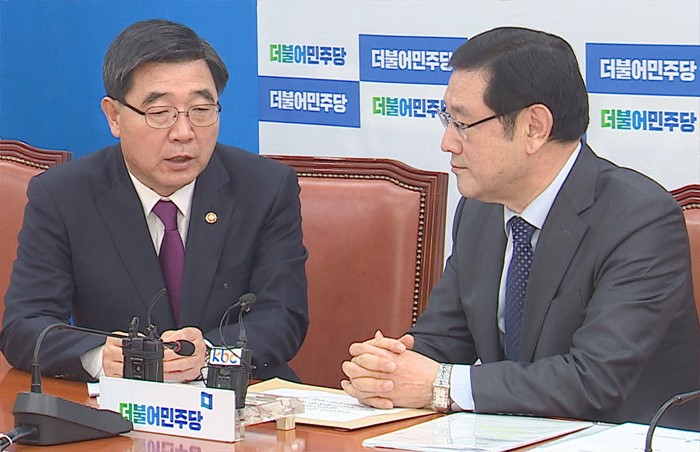 (서울=포커스뉴스) 이용섭(오른쪽) 더불어민주당 총선정책공약단장이 9일 오전 서울 여의도 국회에서 이기권 고용노동부 장관와 면담을 갖고 삼성전자 광주사업장 이전 등 광주지역 고용불안 해소와 정부차원의 고용대책 마련을 건의하고 있다. <사진제공=더민주 총선정책공약단>