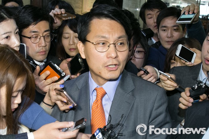 (서울=포커스뉴스) 김무성 새누리당 대표를 향한 욕설로 당내 파문을 일으킨 윤상현 의원이 9일 오전 서울 여의도 새누리당 대표최고위원실 앞 로비에서 기자들의 질문에 답변하고 있다. 전날 윤 의원은 전화를 통해 김 대표를 거론하며 욕설한 사실이 언론에 공개됐으며, 이날 김 대표에게 면담을 요청했으나 거절됐다.