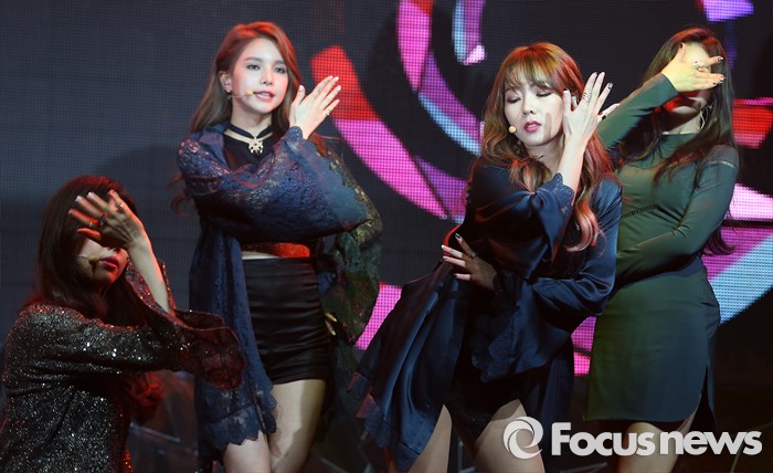 (서울=포커스뉴스) 9일 오전 서울 마포구 예스24 무브홀에서 열린 걸그룹 피에스타의 미니앨범 'A Delicate Sense' 발표 쇼케이스에 참석한 멤버들이 신곡 'Mirror'의 무대를 선보이고 있다. 왼쪽부터 멤버 린지, 재이, 혜미, 차오루.
