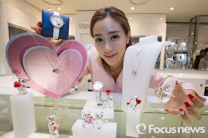 (서울=포커스뉴스) 9일 오전 중구 롯데백화점 본점에서 스와로브스키(SWAROVSKI)의 '화이트데이 컬렉션'을 모델이 선보이고 있다. 제품은 디어(Dear) 네크리스와 뱅글, 블로우(Blow) 이어링, 데이타임(Daytime) 워치로 구성되어 있다.