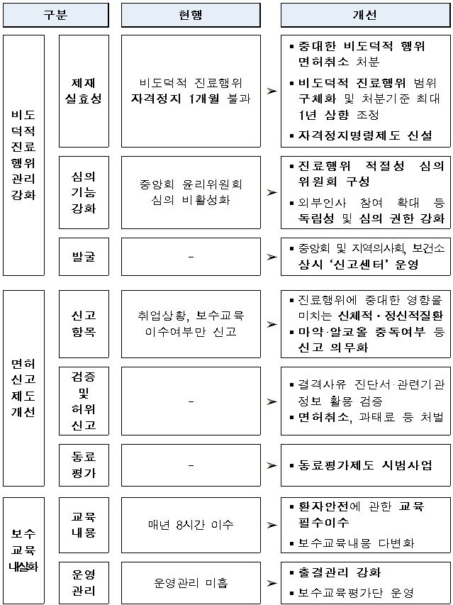 복지부 관계자는 “이번에 마련된 의료인 면허관리 개선방안으로 국민들은 보다 안전하게 진료 받을 수 있는 의료 환경이 조성되고, 의료인들은 일부 의료인의 부적절한 진료행위를 스스로 발굴해 징계할 수 있는 체계를 갖추게 됨으로써 국민들에게 더 신뢰받을 수 있게 되기를 기대한다”고 말했다.의료인 면허관리 개편 전후 비교 <자료출처=보건복지부>