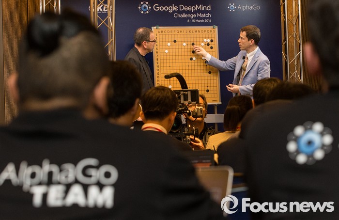 (서울=포커스뉴스) 9일 오후 서울 종로구 포시즌스 호텔에서 열린 이세돌 9단과 알파고의 '구글 딥마인드 챌린지 매치'에서 관계자들이 대국 해설을 보고 있다.