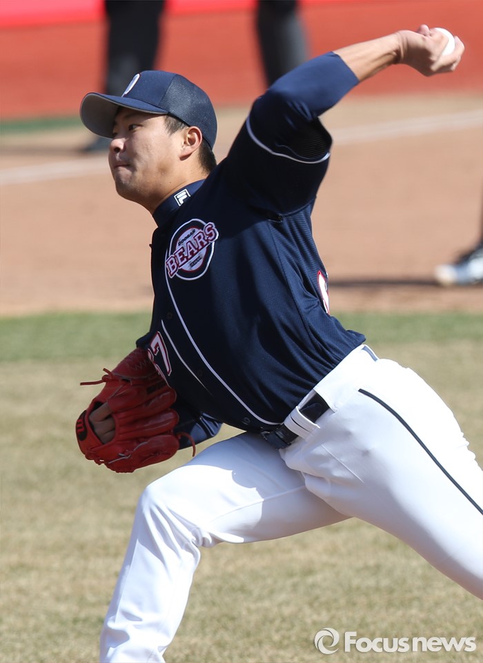 (수원=포커스뉴스) 9일 수원 kt위즈파크에서 열린 2016 KBO리그 시범경기 두산-kt 경기에서 두산 투수 이현호가 5회 무사 1,2루에서 등판해 투구하고 있다.
