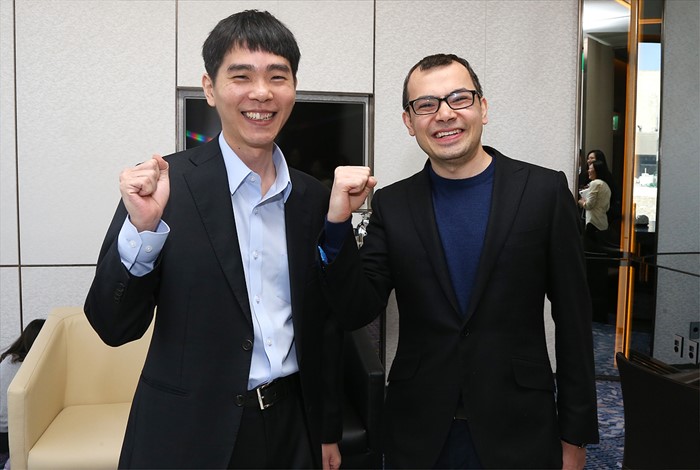 (서울=포커스뉴스) 바둑기사 이세돌(왼쪽) 9단이 9일 오후 서울 중구 포시즌스호텔에서 구글 딥마인드 챌린지 매치, 인공지능 바둑프로그램 알파고와의 대국을 앞두고 데미스 하사비스 구글 딥마인드 최고경영자와 기념촬영을 하고 있다. <사진제공=구글>