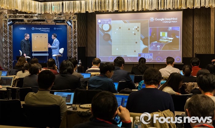 (서울=포커스뉴스) 9일 오후 서울 종로구 포시즌스 호텔에서 열린 이세돌 9단과 알파고의 '구글 딥마인드 챌린지 매치'에 참석한 취재진이 대국을 관전하고 있다.