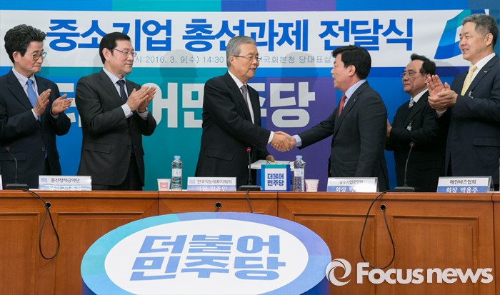 (서울=포커스뉴스) 김종인(왼쪽 세번째) 더불어민주당 비대위 대표가 9일 오후 서울 여의도 국회에서 열린 중소기업중앙회 회장단 총선과제 전달식에 참석해 박성택(오른쪽 세번째) 중소기업중앙회장으로부터 과제를 전달받고 있다.