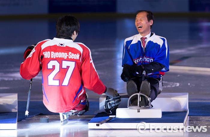 (춘천=포커스뉴스) 9일 오후 강원 춘천의암빙상장에서 제2회 2018 평창 패럴림픽 데이에 참석한 최문순 강원도지사가 패럴림픽 성공을 기원하며 아이스슬레지하키 시타를 하고 있다.